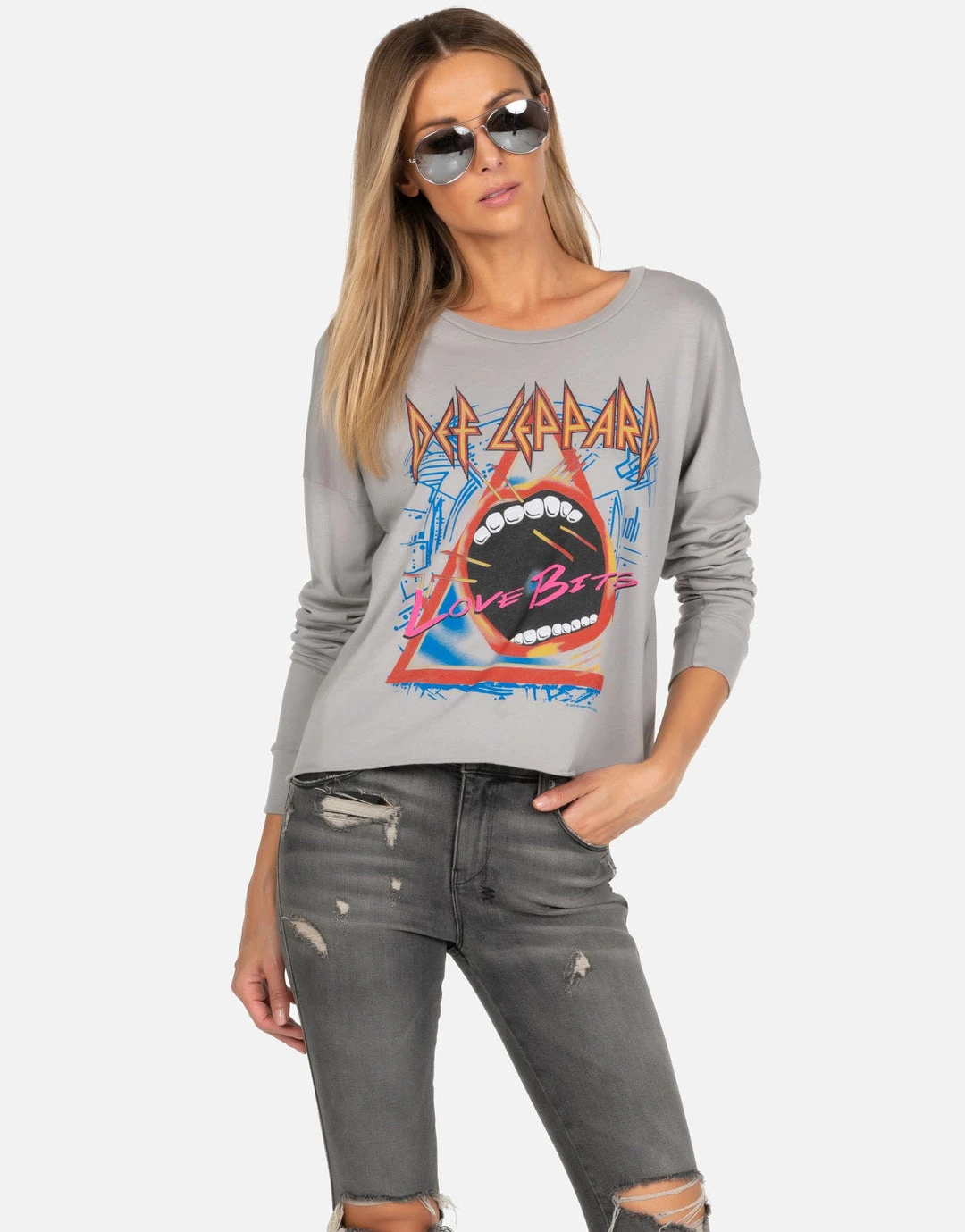 Def Leppard Love Bites Printed on Ultra Soft Lightweight Pullover in Heather Grey by Lauren Moshi.