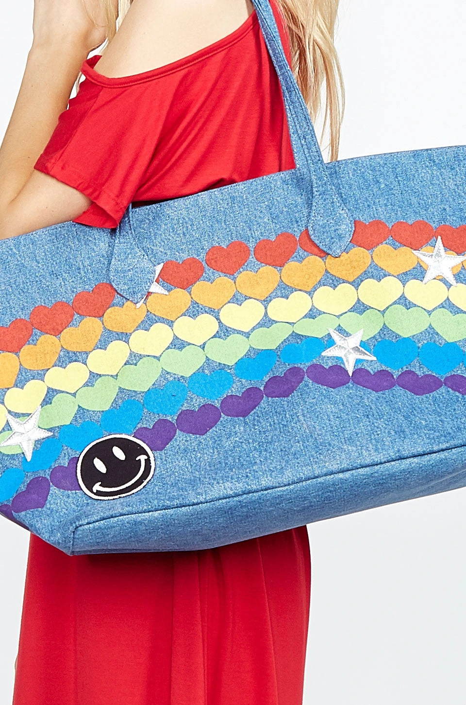 Printed Rainbow Heart with Metallic Star Happyface Tote Bag in Hada Mada Denim. Limited Quantities Available on this Lauren Moshi Web Exclusive!