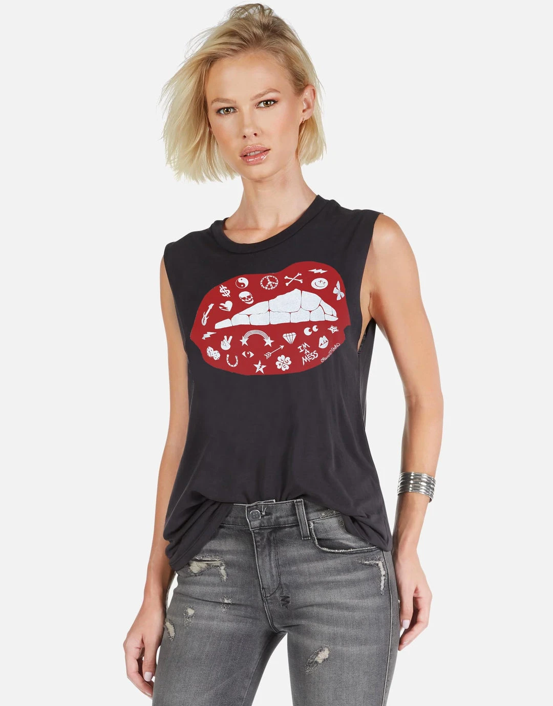 WEB EXCLUSIVE | Elements Lip Printed on Ultra Soft Lightweight Muscle Tank in Onyx by Lauren Moshi.