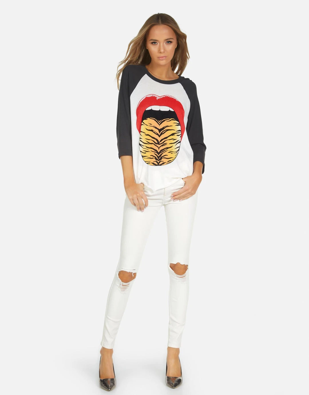 WEB EXCLUSIVE | Tiger Tongue Printed on Ultra Soft Lightweight Baseball Tee in Milk / Onyx by Lauren Moshi.