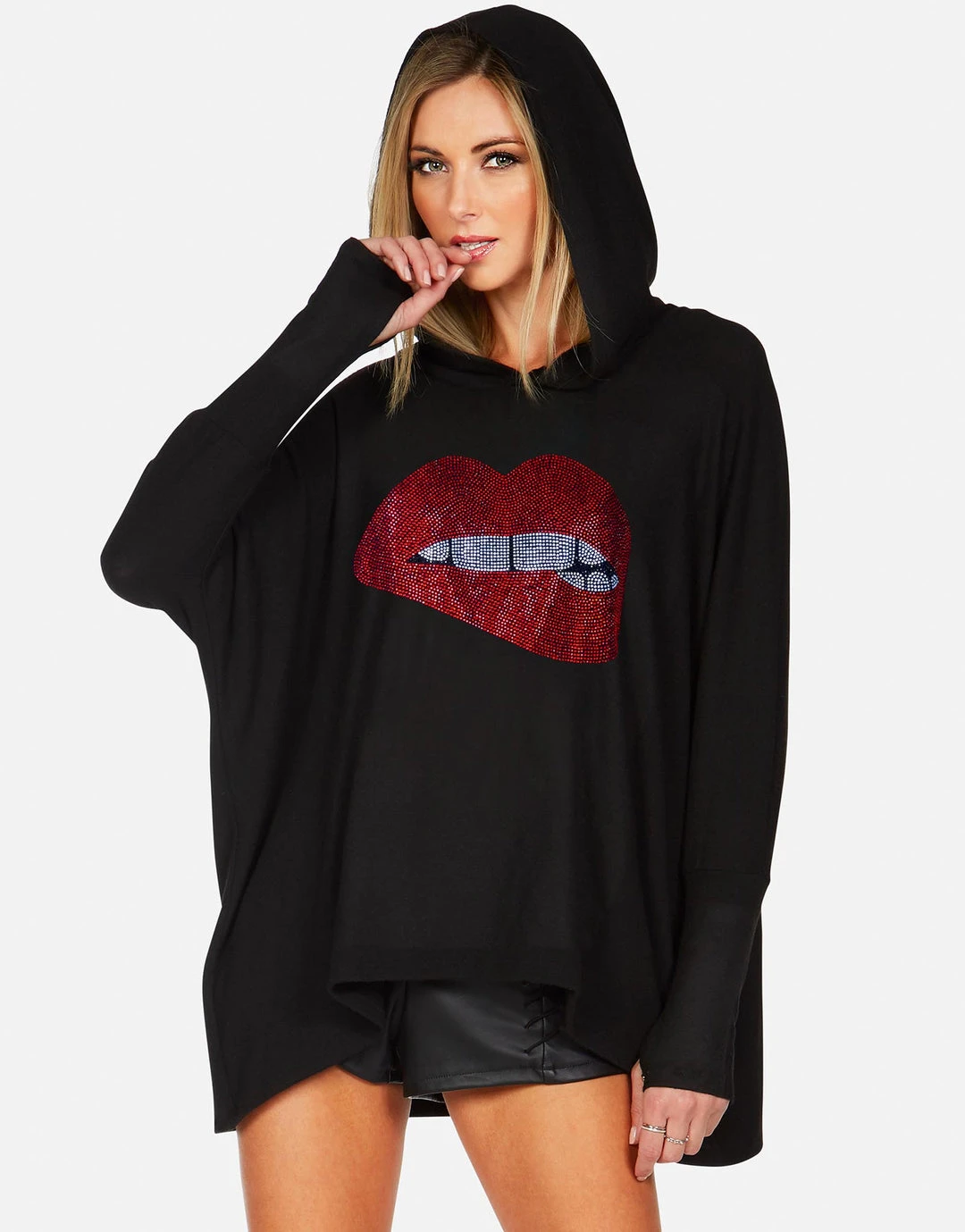 WEB EXCLUSIVE | Crystal Biting Lip on Ultra Soft Lightweight Hoodie in Jet Black by Lauren Moshi.