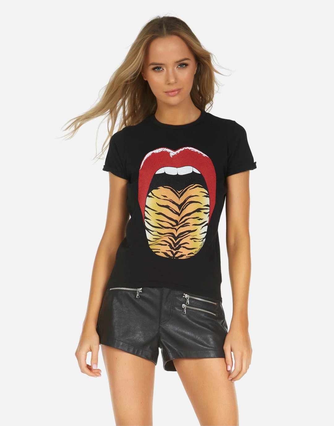 WEB EXCLUSIVE | Tiger Tongue Printed on Ultra Soft Lightweight Tee in Black by Lauren Moshi.