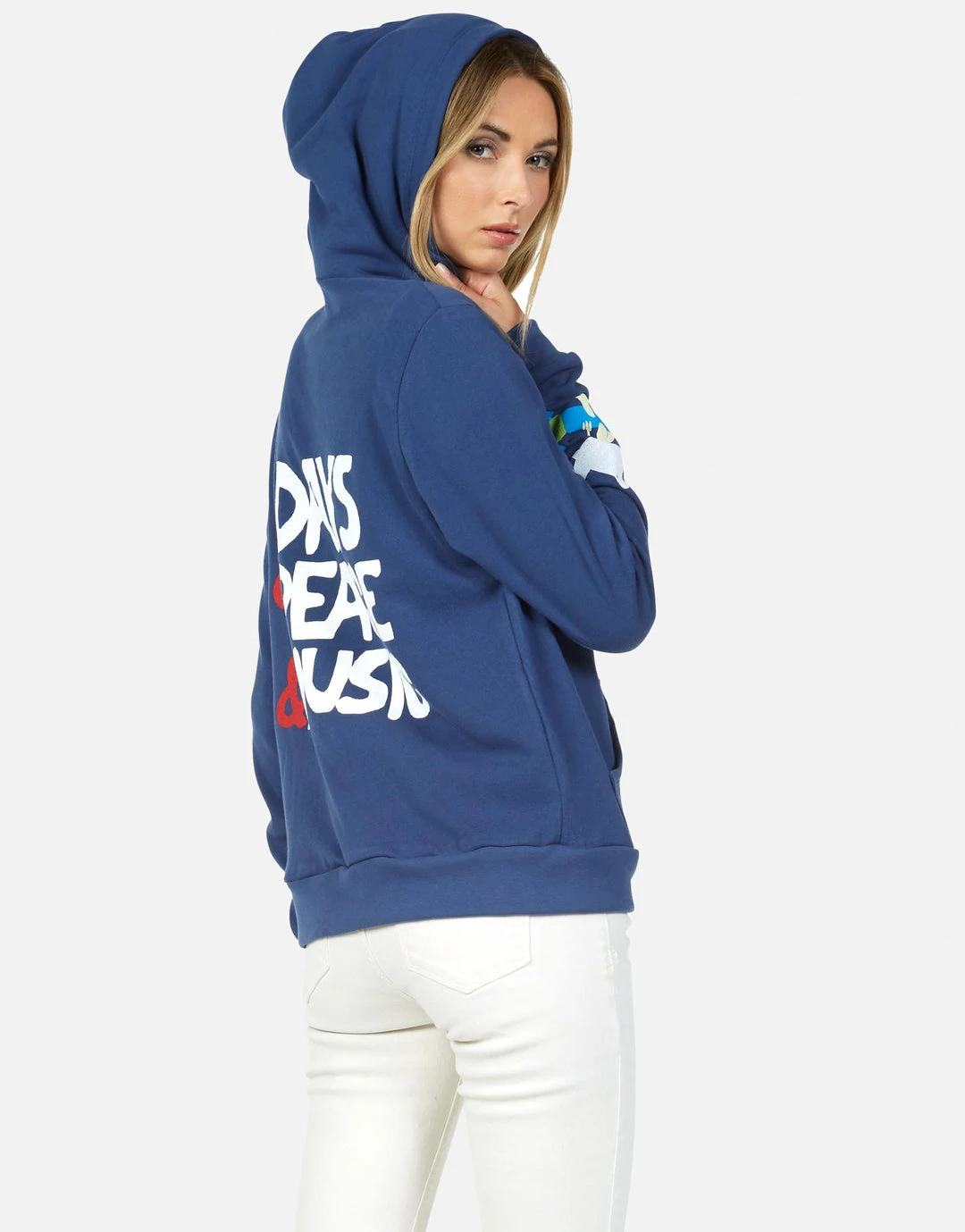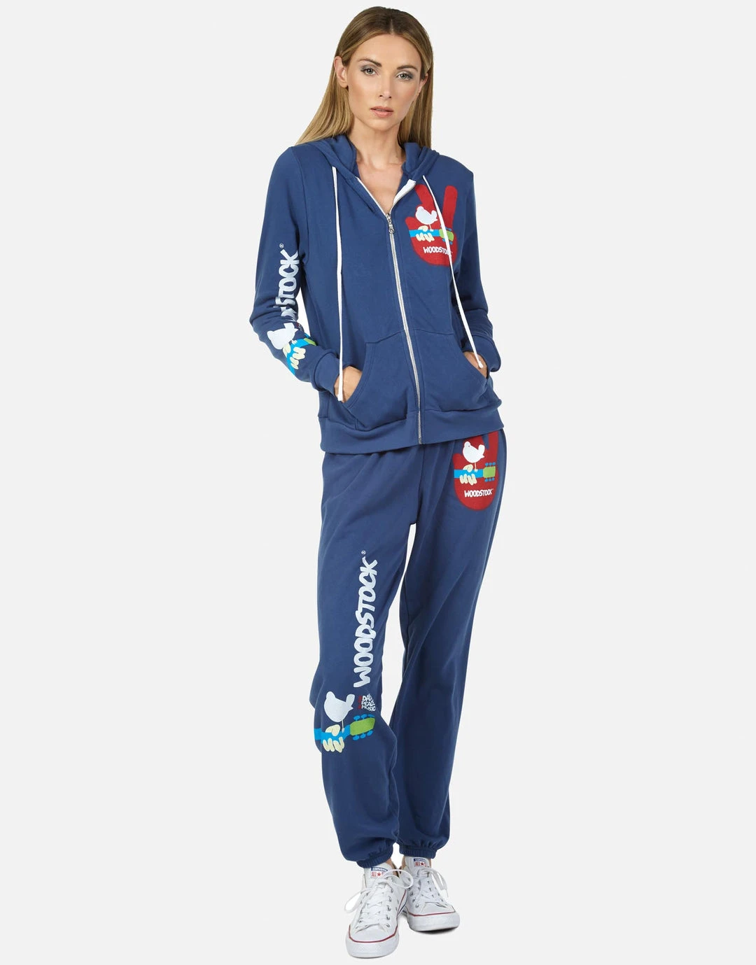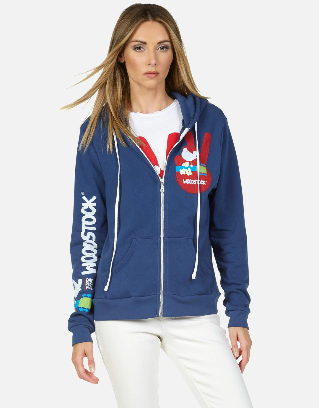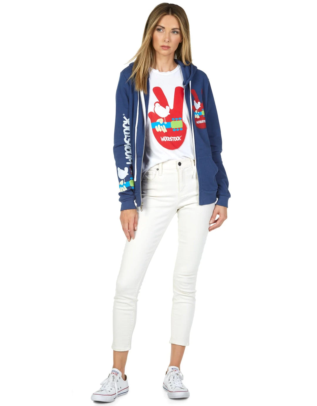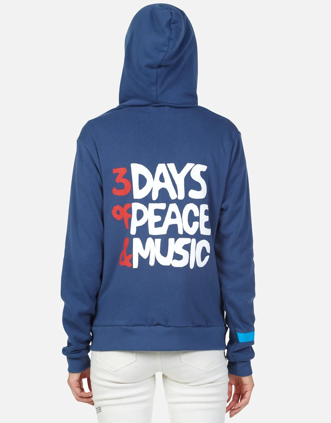 Woodstock Peace Printed on Ultra Soft Lightweight Pullover Hoodie in Ink Blue by Lauren Moshi.
